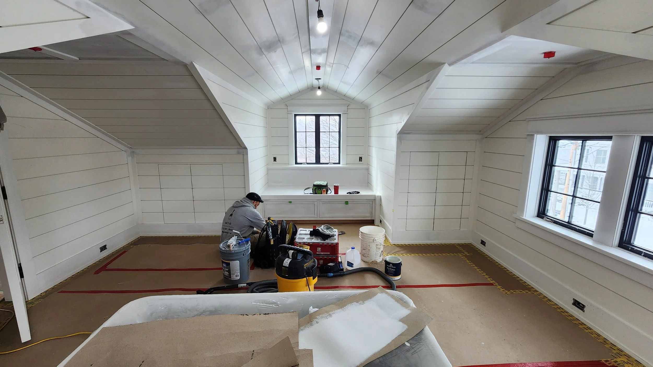 At this project we filled & sanded nail holes and caulked open seams in the shiplap to prep for spraying by Parker Painting
