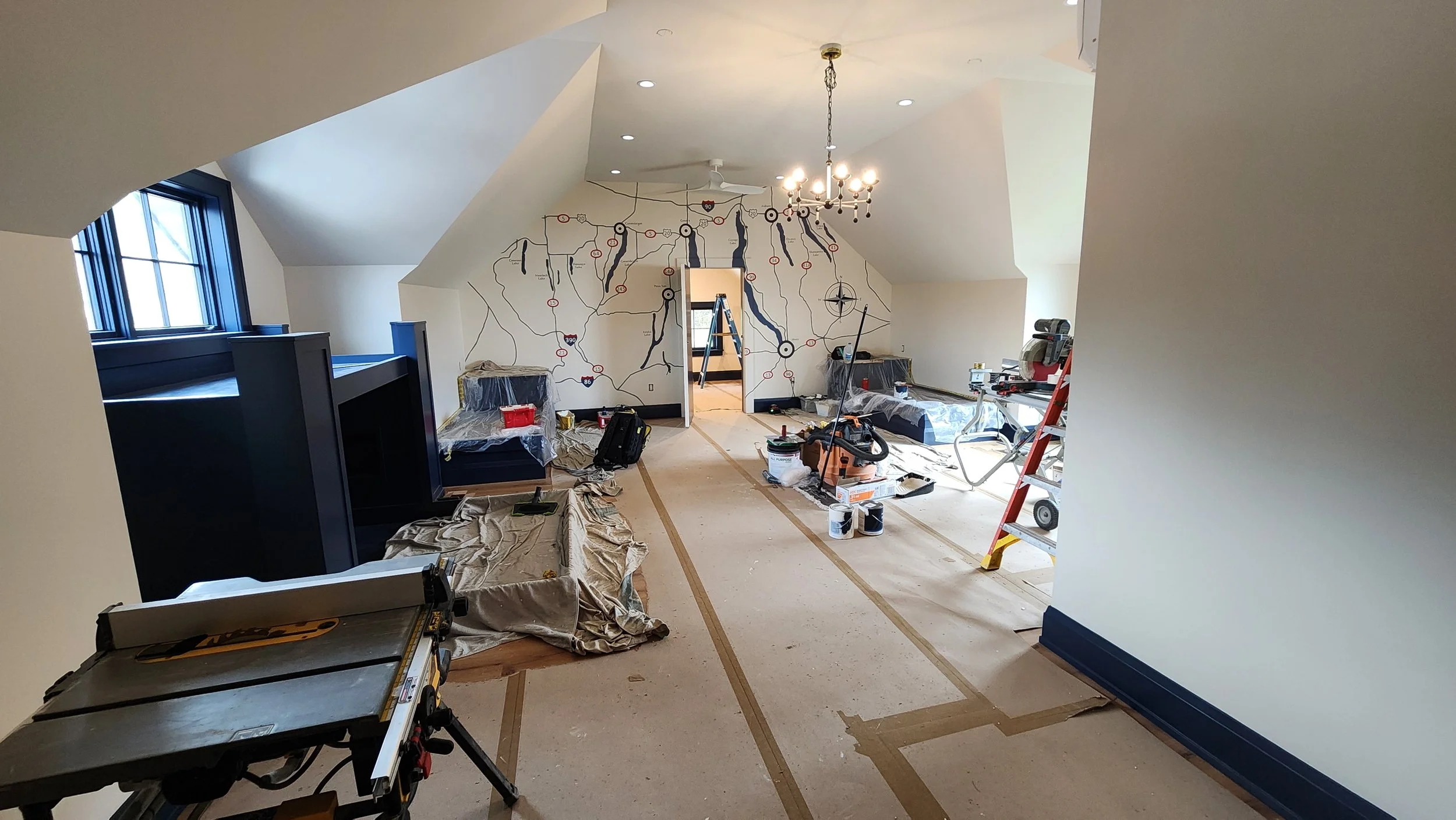 At this project we made some drywall repairs and applied the final coats on the walls and ceiling. Initial coats and trim work completed by Parker Painting. Finger lakes mural completed by Chuck Gridley