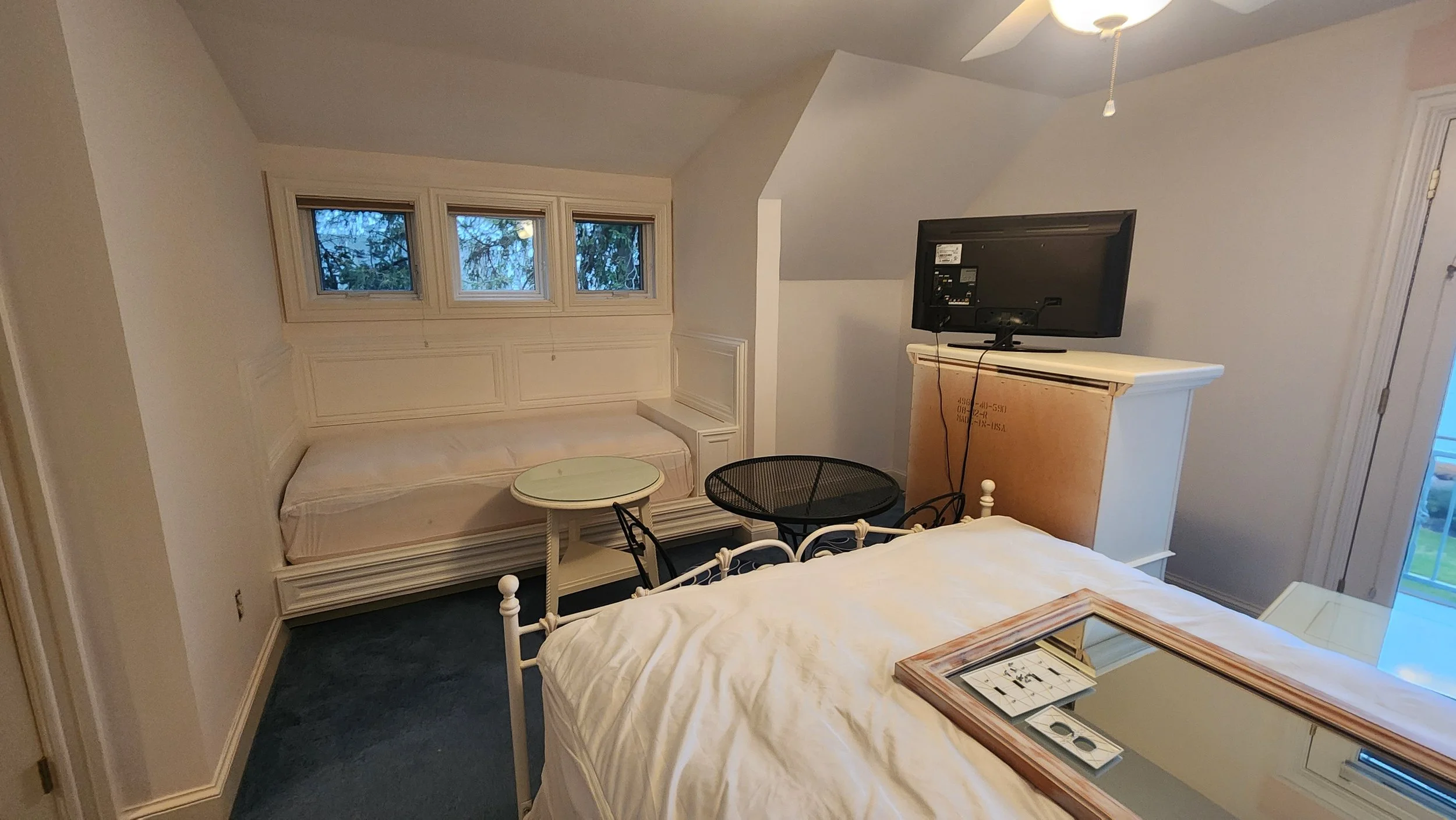 At this airbnb on Cayuga Lake we changed some of the tongue and groove pine boards to Chantilly Lace from Benjamin Moore