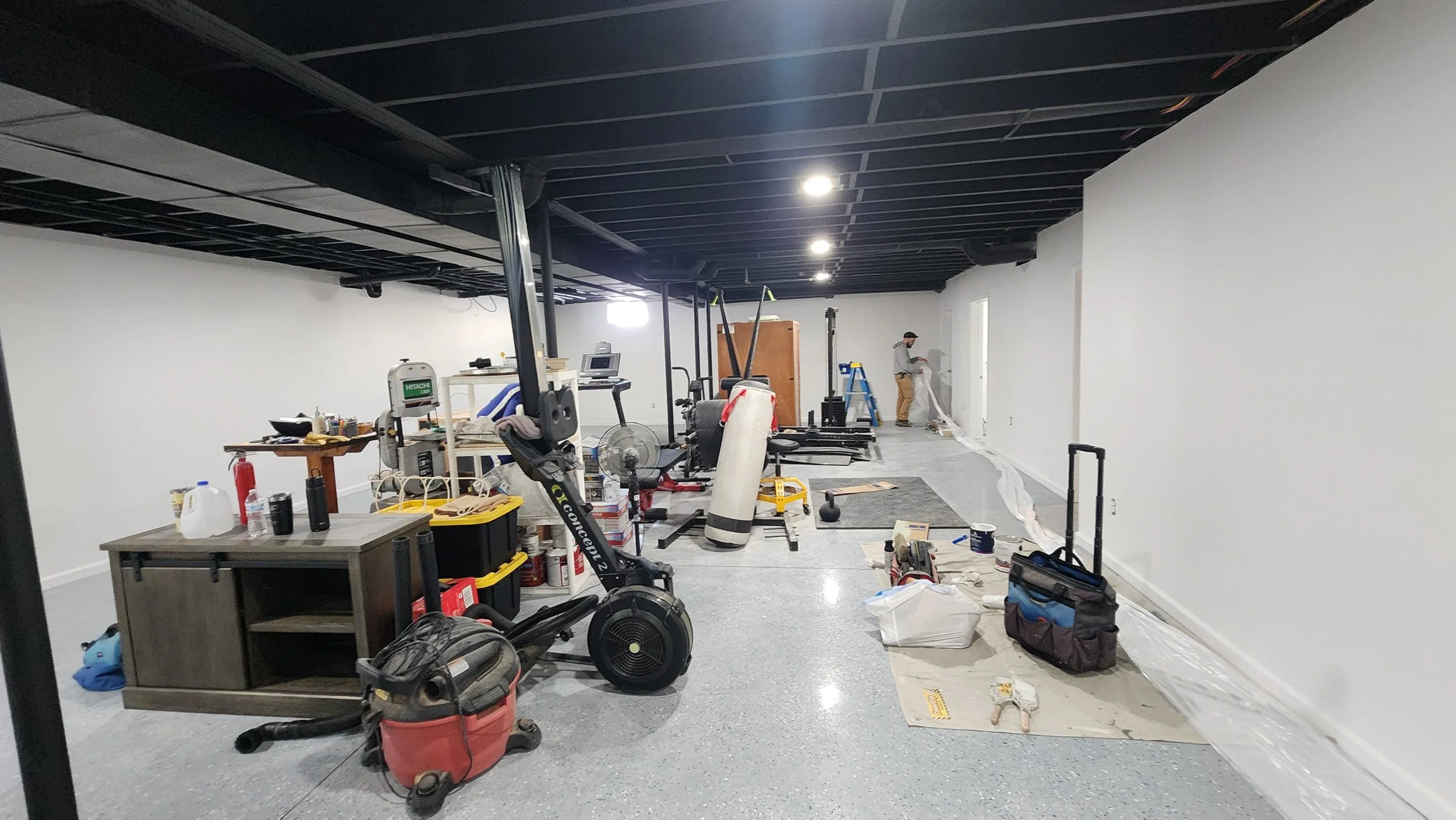 At this basement remodel we sprayed the ceilings joists and ducting flat black. The walls were finished with a matte white and the trim with satin white, the doors in the back right corner are for the new in-law suite! The happy new parents will need help with the baby